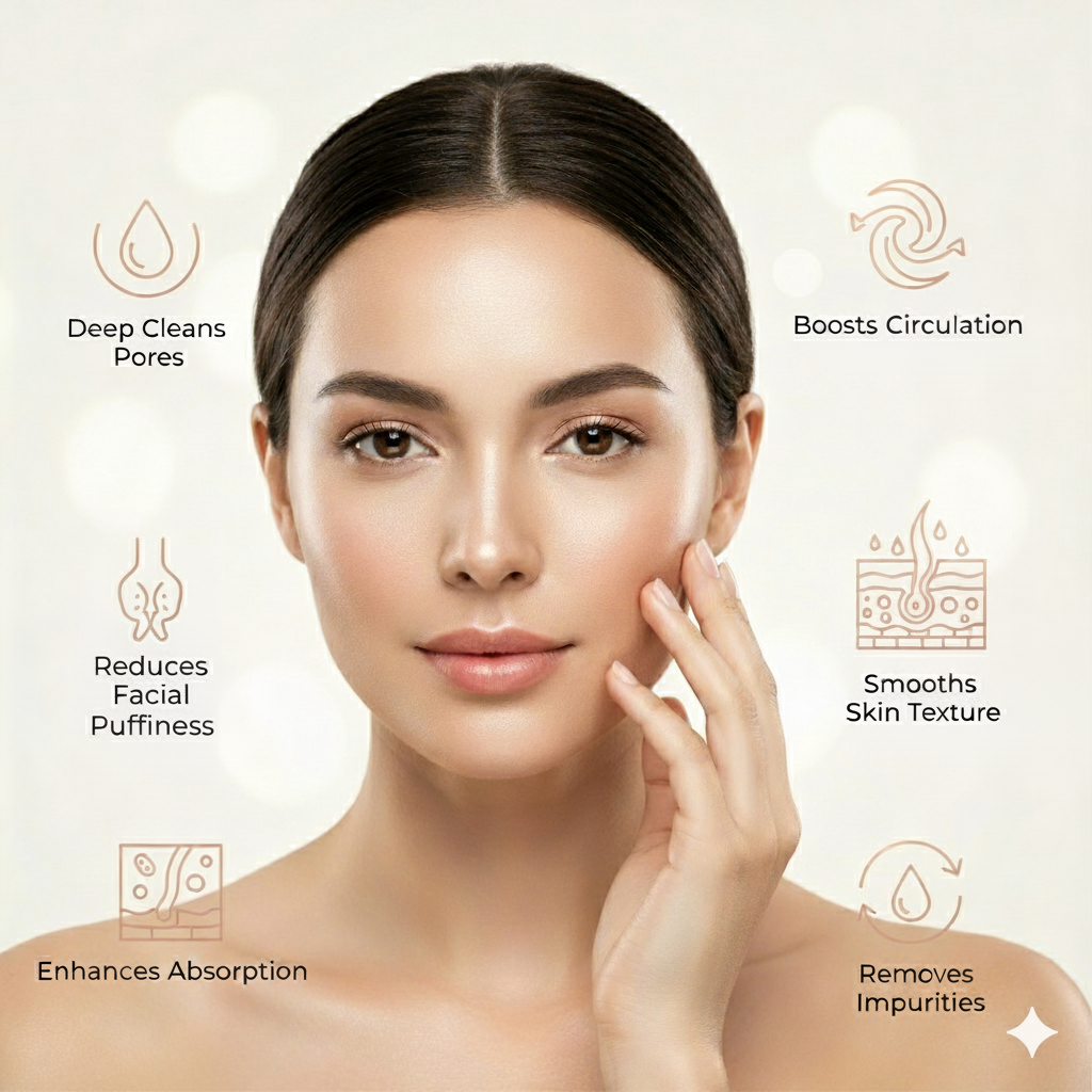 Improves blood flow, boosts serum absorption, and minimizes the appearance of large pores — leaving your skin radiant and refreshed.